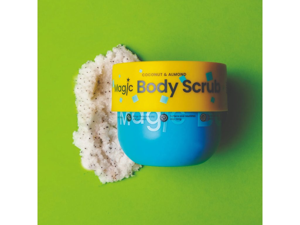 - Magic Scrub Kokos & Mandle sugar body scrub zjemňuje a vyživuje pokožku po dobu celého dne